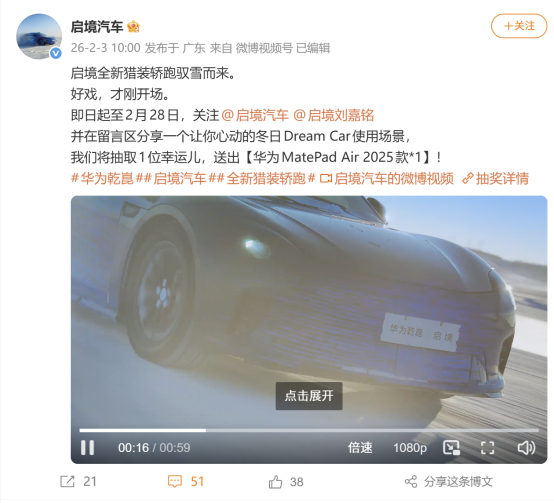 在车身尺寸方面,启境首款猎装轿跑车长超5米、车宽近2米,拥有越级体量。其独特的溜背式设计在保 留轿跑动感背影的同时,完美解决了传统轿跑空间局促的痛点,实现了优雅与实用的平衡。 值得注意的是,作为30万级唯一搭载华为乾崑全家桶的猎装轿车,该车不仅在设计上确立了美学标杆, 更在智能科技层面实现了全面升维。它深度融合了华为乾崑智驾ADS、鸿蒙座舱及乾崑数字底盘引擎等 全栈技术,可为用户打造集"优雅颜值+跑车级操控+SUV通过性+旅行车空间"于一体的全能驾乘体验。 此次呼伦贝尔冬测不仅是对车辆机械素质的严苛考验,更标志着启境在高端猎装轿跑细分市场布局的实 质性落地,进一步丰富了消费者对智能豪华出行的想象。 作为华为乾崑在猎装轿跑领域的开山之作,此次冬测视频展示了车辆在极寒环境下的动态表现。据官方 解读,该车通过"一升一降"的系统工程,实现了顶级性能车才具备的黄金轮高比(大于50%),配合长车 头、长轴距的经典比例,不仅塑造了极具侵略性的低趴姿态,更兼顾了修长优雅的侧面线条。 2月3日消息,备受瞩目的启境首款猎装轿跑在呼伦贝尔诺干湖寒区测试场开启了紧张的冬季测试。随着 轻伪装路试车图与动态视频的首次曝光,这款华为乾崑技 ...