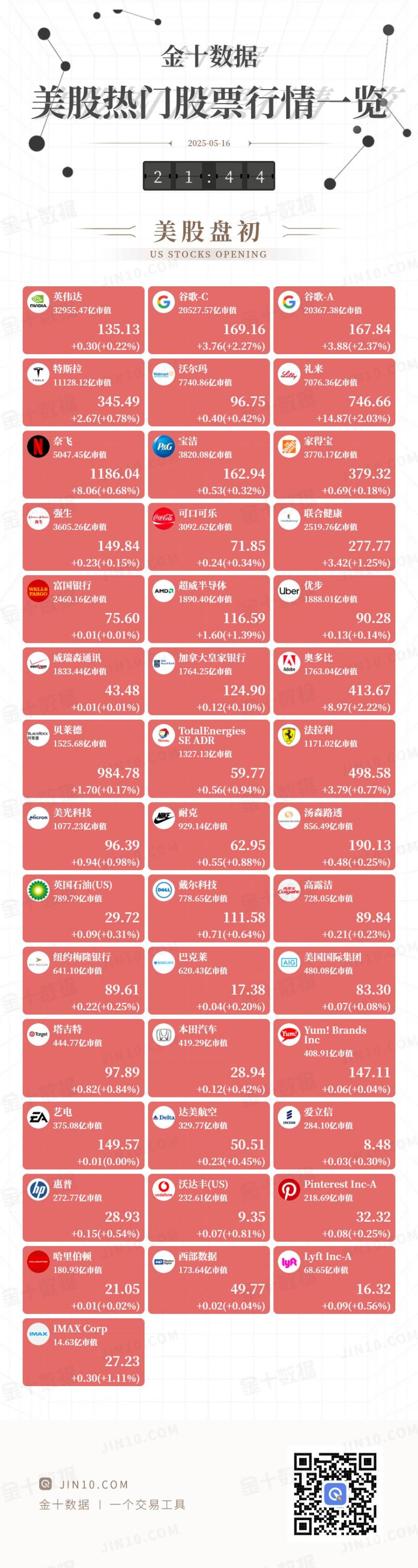 金十图示:2025年05月16日(周五)美股热门股票行情一览(美股盘初)