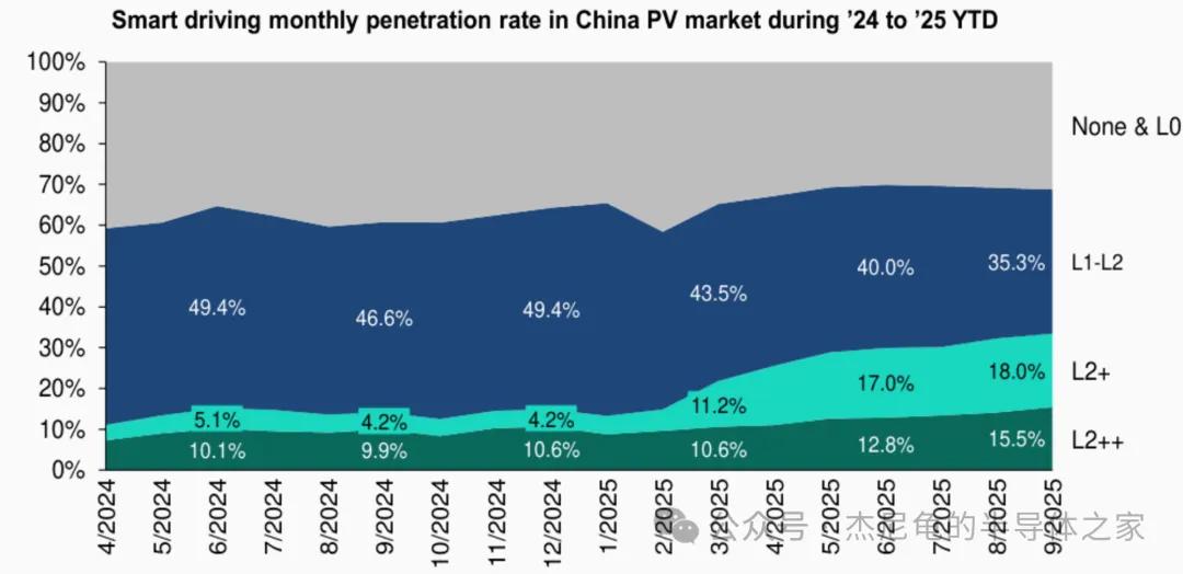 2025年,电动车已经成产能过剩重点"关照"的行业,电动化技术创新接近尾声,车企陷入同质化 "无效内卷",净利率持续承压。 汽车行业迈入从电动车向智能汽车转型的下半场,用户对体验升级的追求是核心驱动力,智能化被看成了重构竞争壁垒的关键。而在智能驾驶赛道,智驾 芯片供应商是关键"卖铲人"。 地平线作为国产智驾芯片核心玩家,24年国内出货量市占率有三四成,25年开推高阶芯片J6P,搭配城市NOA算法HSD,向英伟达发起冲击。 但同年,蔚来、小鹏、理想、比亚迪等纷纷开始自研芯片,市场开始担心车企自研后,地平线还剩多大价值? 海豚君对于地平线的深度研究将覆盖以下几个核心问题: 以下是详细分析 一、智驾芯片的市场空间如何? a. 下游需求端: 智驾渗透率加速,高阶升级更快 从新能源车的智能化渗透率来看,2024年中国仍仅有11%的新车配备了L2+级别的ADAS功能(其中高速NOA 4%, 城市NOA 7%)。 但2025年,在以比亚迪为首的"智驾平权" 将高速NOA下沉到10-20万元级别的平价车型中;以华为和新势力为首的"智驾引领"梯队则加速普及高阶的城市 NOA,L2+及以上9月达到了33.5%,智驾渗透率正在加速 ...
