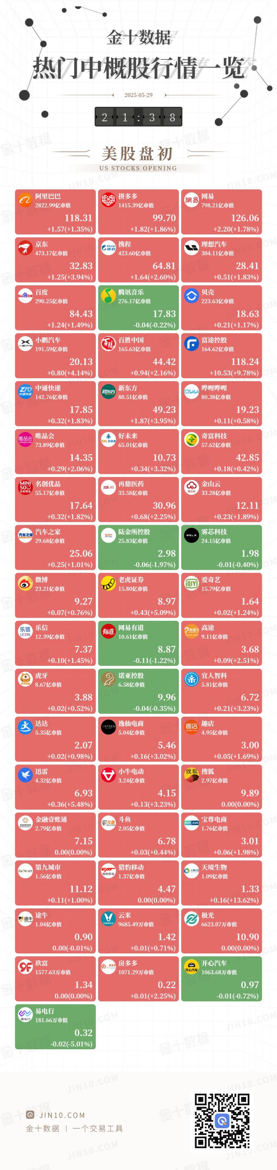金十图示:2025年05月29日(周四)热门中概股行情一览(美股盘初)