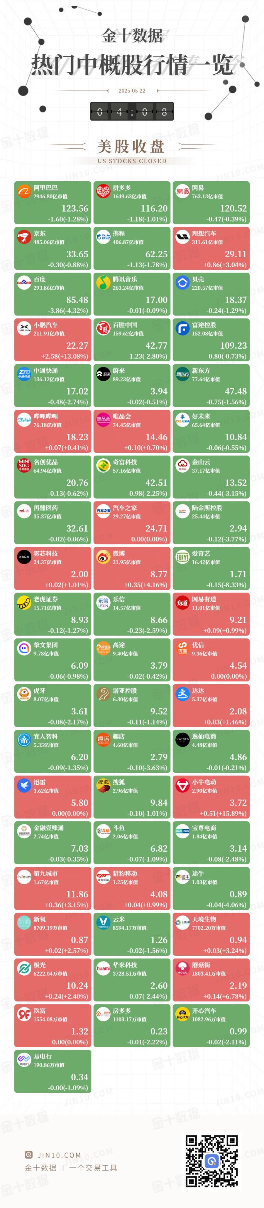 金十图示:2025年05月20日(周二)热门中概股行情一览(美股收盘)