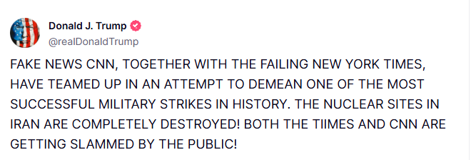 特朗普驳斥纽约时报和CNN关于伊朗袭击的报道 金十数据6月25日讯,美国总统特朗普在其社交媒体平台"真实社交"上发文称,假新闻CNN和失败的 《纽约时报》联手,试图贬低历史上最成功的军事打击之一。伊朗的核设施被彻底摧毁了!《纽约时 报》和CNN都受到了公众的抨击! ...