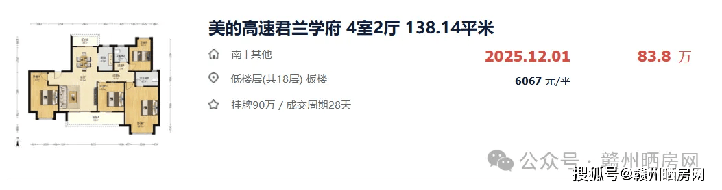突然发现,赣州越来越多的楼盘进入到新房、二手房同时都有房源销售的局面。 近日,小编浏览二手房平台时发现,赣州美的高速君兰学府迎来首套二手房成交,单价6067元/㎡,一起来看看具体情况。 *本文数据来源于某二手房平台,数据随时变动,仅供参考,具体以实际为准! 此次成交户型为建筑面积约138.14㎡四房两厅,带南北双阳台设计,是市面上比较常见的户型,位于低楼层(共18层),为小高层产品。 这套房源于2025年11月3日挂牌,首次挂牌总价109.66万元,经历1次调价,最终成交单价6067元/㎡,成交总价83.8万元,成交周期28天,约一个时间不 到,期间带看9次。 在新房销售价格比较有优势的情况下,二手房很难卖出高价,所以文中开头成交的首套二手房房源,单价6字头成交,也在情理之中。 美的高速君兰学府于2024年3月31日一期迎来交房,共535户交付,至今已有一年九个月时间。 在二手房平台上挂出房源并不多,仅有9套,挂牌均价在7882元/㎡,近90天成交1套,也就是文中开头成交的房源,近30天带看51次,有一定热度,但不 高。 | 美的局速右三字时 章页 黄金开发区 | | | 查看小区详情 | | --- | - ...