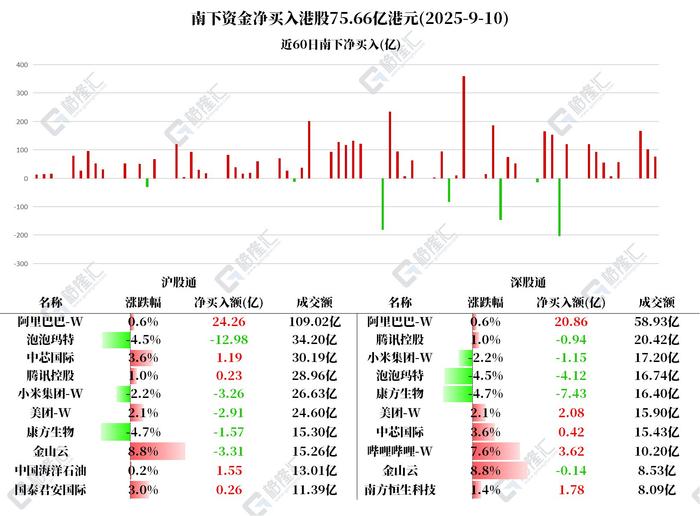 南向资金今日净买入75.66亿港元 阿里净买入额居首