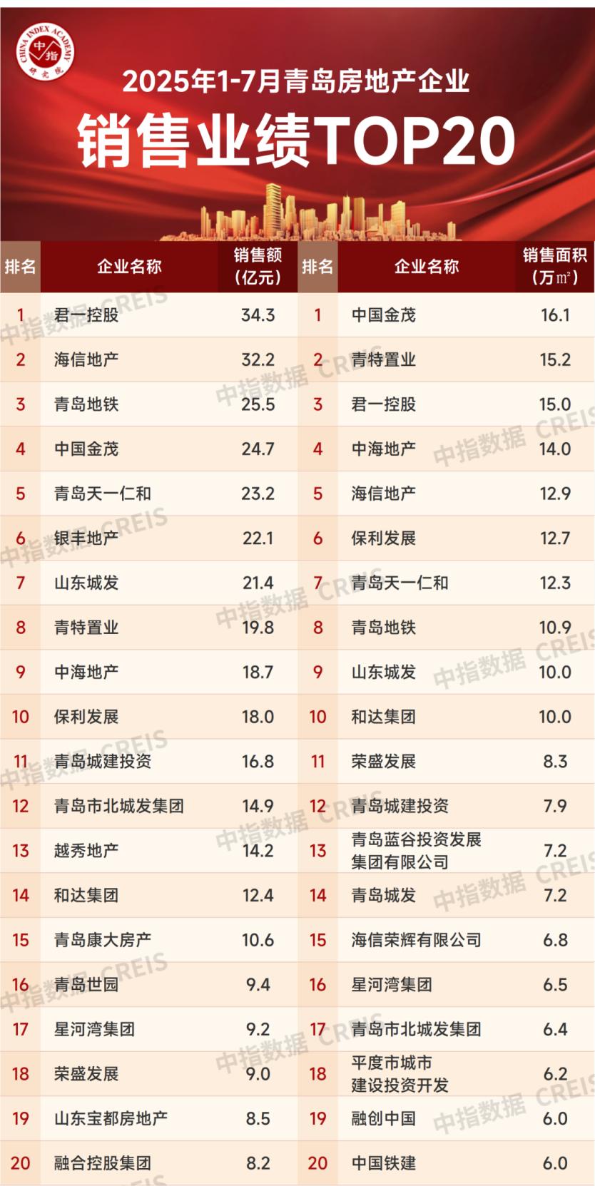 2025年1-7月份,青岛房地产企业销售金额TOP20企业合计销售金额为344.9亿元,销售面积TOP20企业合计销售面积197.6万平。君一控股在2025年继续领 先,以34.3亿元/15万平的销售业绩夺得销售金额、销售面积排行榜双冠军;海信地产以32.2亿元/12.9万平的销售业绩位列销售金额第二名、面积排行榜第 五名;同时青岛地铁以25.5亿元/10.9万平的销售业绩位居金额第三名、面积榜第八名。 2025年1-7月份,青岛商品住宅市场成交金额约595.9亿元,成交面积约399.5万平,弱于去年同期水平。下面让我们来看一下2025年1-7月青岛房地产企业 的销售表现: | | | | 2025年1-7月青岛房地产企业 | | | | --- | --- | --- | --- | --- | --- | | | | | 销售业绩TOP20 | | | | | 企业名称 | 销售额 (亿元) | | 企业名称 | 销售面积 (万 m2) | | | | 34.3 | 1 | 中国台成 | 16.1 | | 2 | 海信地产 | 32.2 | | 2-D青特置业 | 15.2 | | 3 | 青岛地铁 | ...