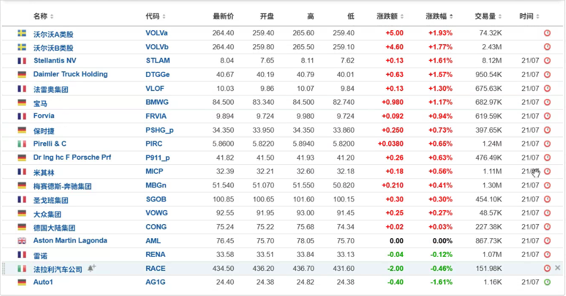 欧洲汽车制造概念股普遍收涨,沃尔沃A类股、斯泰兰蒂斯Stellantis、戴姆勒卡车、法雷奥、宝马至多涨1.93%。 | 名称 = | 代码 : | 最新价 | 开盘 | 高 | (BE | 涨跌额 = | 涨跌幅 = | 交易量 : | 时间 = | | --- | --- | --- | --- | --- | --- | --- | --- | --- | --- | | 沃尔沃A类股 | VOLVa | 264.40 | 259.40 | 265.60 | 259.40 | +5.00 | +1.93% | 74.32K | O | | 沃尔沃B类股 | VOLVb | 264.40 | 259.80 | 265.50 | 259.10 | +4.60 | +1.77% | 2.43M | 0 | | Stellantis NV | STLAM | 8.04 | 7.65 | 8.11 | 7.62 | +0.13 | +1.61% | 8.12M | 21/07 © | | Daimler Truck Holding | DTGGe | 40.67 | 40.19 | 40.79 | 40.01 | ...