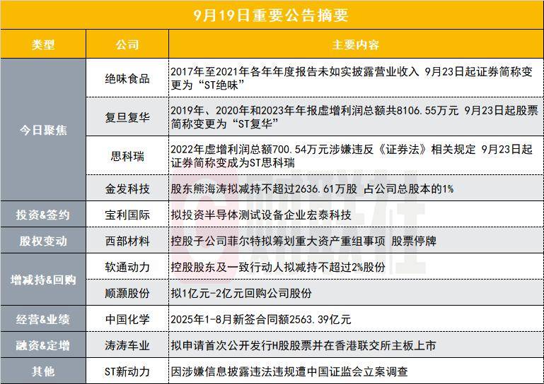 【绝味食品:2017年至2021年各年年度报告未如实披露营业收入 9月23日起证券简称变更为"ST绝味"】 【复旦复华:2019年、2020年和2023年年报虚增利润总额共8106.55万元 9月23日起股票简称变更为"ST复 华"】 【创意信息:2022年年报、2023年半年报多计营业收入 9月23日起股票简称变更为"ST创意"】 【思科瑞:2022年虚增利润总额700.54万元涉嫌违反《证券法》相关规定 9月23日起证券简称变成为ST思科 瑞】 【金发科技:股东熊海涛拟减持不超过2636.61万股 占公司总股本的1%】 【沪电股份:拟筹划发行H股股份并在香港联交所主板挂牌上市】 沪电股份(002463.SZ)公告称,公司拟筹划在境外发行股份(H股)并在香港联交所主板挂牌上市。截至目 前,公司正计划与相关中介机构就本次H股发行上市的相关工作进行商讨,相关细节尚未最终确定。 | | | 9月19日重要公告摘要 | | --- | --- | --- | | 类型 | 公司 | 主要内容 | | 今日聚焦 | 绝味食品 复日复杂 | 2017年至2021年各年年度报告未如实披露营业收入 9月23日起证券简称变 ...