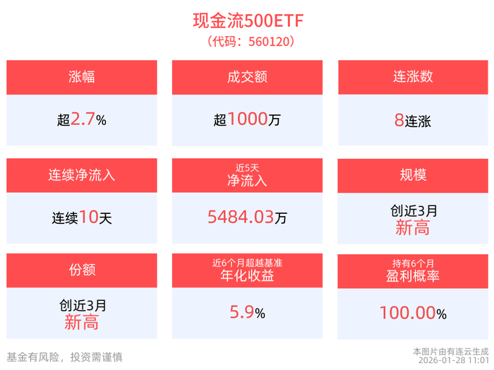 Core Viewpoint - The Zhongzheng 500 Free Cash Flow Index has shown a strong increase of 2.5%, with significant gains in constituent stocks such as Silver Nonferrous and Zhejiang Longsheng, indicating a robust performance in the market [1]. Group 1: Index Performance - As of January 28, 2026, the Zhongzheng 500 Free Cash Flow Index has risen by 2.5%, with notable stocks hitting the daily limit up [1]. - The Cash Flow 500 ETF (560120) has increased by 2.79%, marking its eighth consecutive rise, with the latest price at 1.48 yuan [1]. - The Cash Flow 500 ETF has seen an active trading environment, with a turnover rate of 11.55% and a transaction volume of 15.24 million yuan [1]. Group 2: Fund Inflows and Returns - Over the past 10 days, the Cash Flow 500 ETF has experienced continuous net inflows totaling 79.91 million yuan [1]. - As of January 27, 2026, the Cash Flow 500 ETF has achieved a net value increase of 43.03% over the last six months [4]. - The ETF has recorded a maximum monthly return of 7.97% since its inception, with a longest consecutive monthly gain of 3 months and a maximum cumulative increase of 15.21% [4]. Group 3: Index Composition - The Zhongzheng 500 Free Cash Flow Index consists of 50 listed companies with high free cash flow rates, selected from the Zhongzheng 500 Index [4]. - The top ten weighted stocks in the index account for 44.11% of the total index weight, including companies like CIMC Group and Shougang Co. [4]. - The top ten stocks by weight include Silver Nonferrous (5.52%) and Zhejiang Longsheng (5.50%), among others [6].