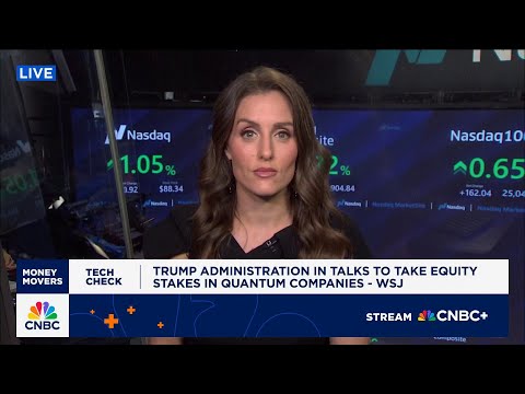 Shares of Quantum Stock surging today after a report that some are in talks with the Trump administration to exchange equity stakes for federal funding. Christina Parsons Neville has more in today's tech check. Christina, >> thanks Mike.Well, the Trump administration is reportedly in talks to take equity stakes. And I say reportedly because uh you you are seeing the stock reaction in INQ, Regetti, Dwave, they're all up double digits. But we do have one outlet that is denying any of this is true at the momen ...
