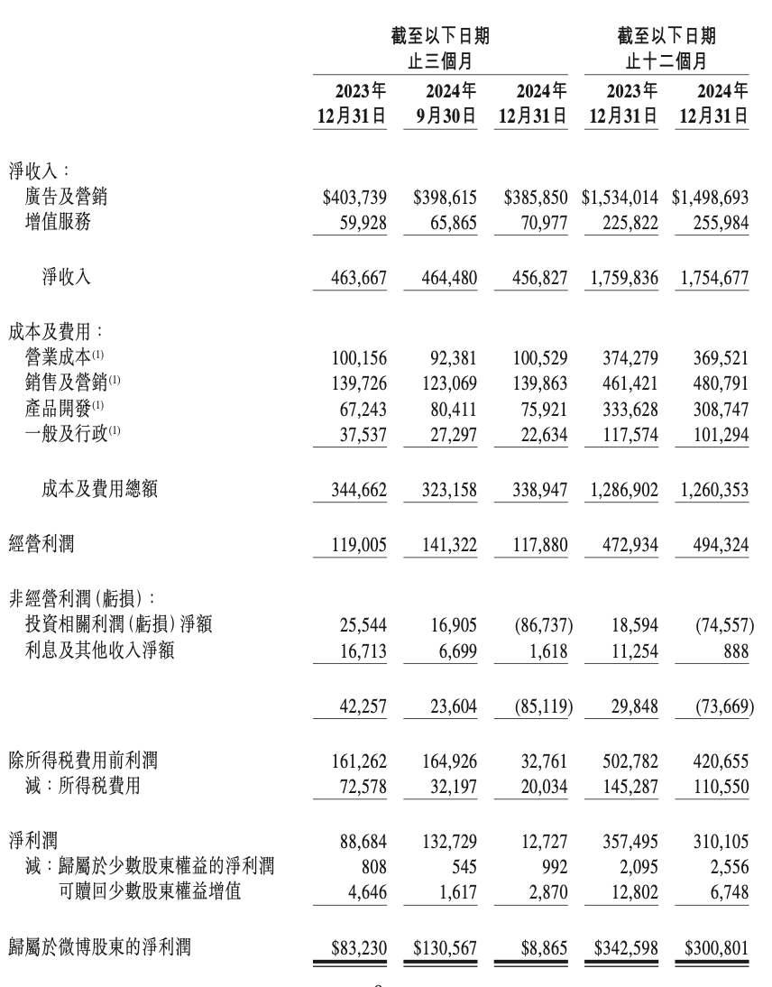 微博陷入增长焦虑:广告、月活均在下滑丨文娱年报观察 在2024年,微博营收17.54亿美元,与2023年基本持平;归母净利润为3亿美元,2023年为3.43亿美元。 而微博营收处于收缩区间最重要原因是,广告收入下滑。 在2024年四季度,微博广告及营销收入为3.86亿美元,同比下滑4%。在2024年,微博此项收入为15亿美元,同比下滑 2%。 背后是,来自在线游戏、化妆品和个人护理以及奢侈品行业的广告收入在第四季度呈下降趋势。这与微博流量特性相关。 还要看到的是,微博流量生态已步入存量。在2024年四季度,微博月活为5.9亿,同比下滑1.3%。 由此,微博正在陷入增长焦虑。 | | | 截至以下日期 | | 截至以下日期 | | | --- | --- | --- | --- | --- | --- | | | | 止三個月 | | 止十二個月 | | | | 2023年 | 2024年 | 2024年 | 2023年 | 2024年 | | | 12月31日 | 9月30日 | 12月31日 | 12月31日 12月31日 | | | 淨收入: | | | | | | | 廣告及營銷 | $403.739 ...