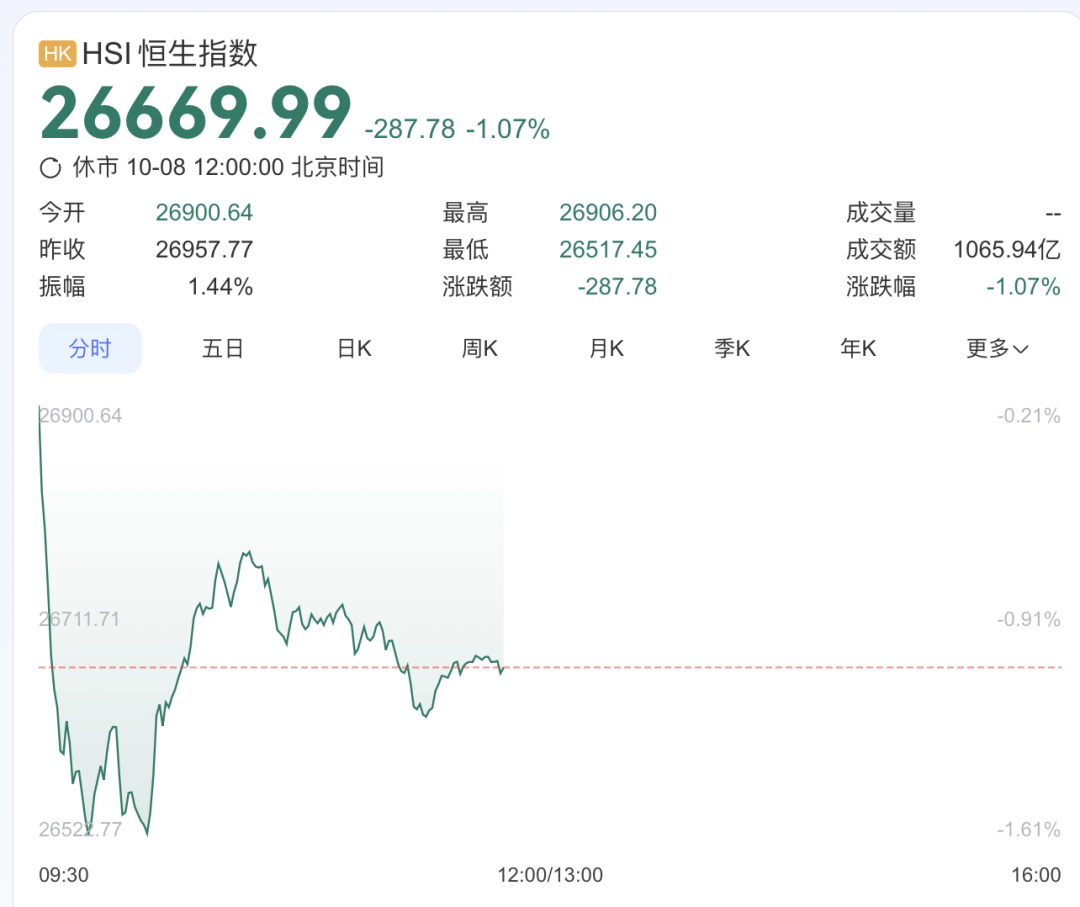 10月8日,港股市场大幅回调。 截至午间收盘,港股市场三大指数均收跌,其中,恒生指数报26669.99点,跌1.07%。恒生指数成份股中,京东健康(06618.HK)涨约2%、美的集团 (00300.HK)跌1.45%、龙湖集团(00960.HK)跌超5%。 恒生科技指数则收报6478.81点,跌1.09%,成份股中阿里巴巴-W(9988.HK)跌超3%,美团-W(3690.HK)跌2.56%,蔚来-SW(09866.HK)跌0.5%,腾 讯控股(0700.HK)跌0.52%。 从具体板块来看,港股人工智能概念股走弱,截至午间收盘,汇量科技(01860.HK)跌7.33%、万国数据-SW(09698.HK)跌6.81%、金山云 (03896.HK)跌3.5%、百度集团-SW(09888.HK)跌3.38%、商汤-W(00020.HK)跌4.51%。 和誉-B(02256.HK)涨超8%,报19.37港元。 汽车板块中,小鹏汽车-W(09868.HK)涨1.82%,吉利汽车(00175.HK)涨2.94%。 光大证券在节前发布的研报认为,港股整体盈利能力相对较强,同时互联网、新消费、创新药等资产相对稀缺。此外, ...