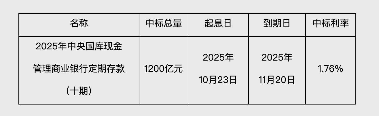人民财讯10月23日电,财政部、中国人民银行于2025年10月23日以利率招标方式进行了2025年中央国库现金管理商业银行定期存款(十期)招投标。中标总量 1200亿元,中标利率1.76%。 | 名称 | 中标总量 | 起息日 | 到期日 | | --- | --- | --- | --- | | 2025年中央国库现金 管理商业银行定期存款 | 1200亿元 | 2025年 | 2025年 | | (十期) | | 10月23日 | 11月20日 | ...
