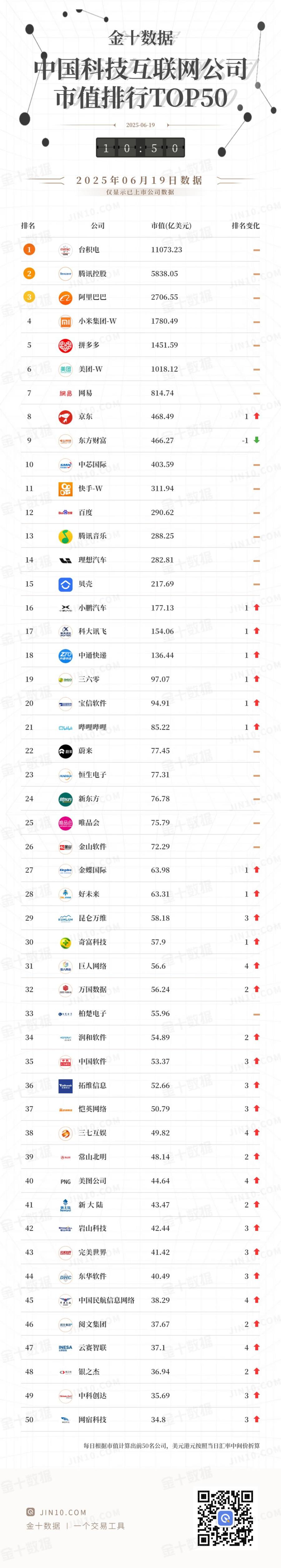 金十图示:2025年06月19日(周四)中国科技互联网公司市值排名TOP 50一览