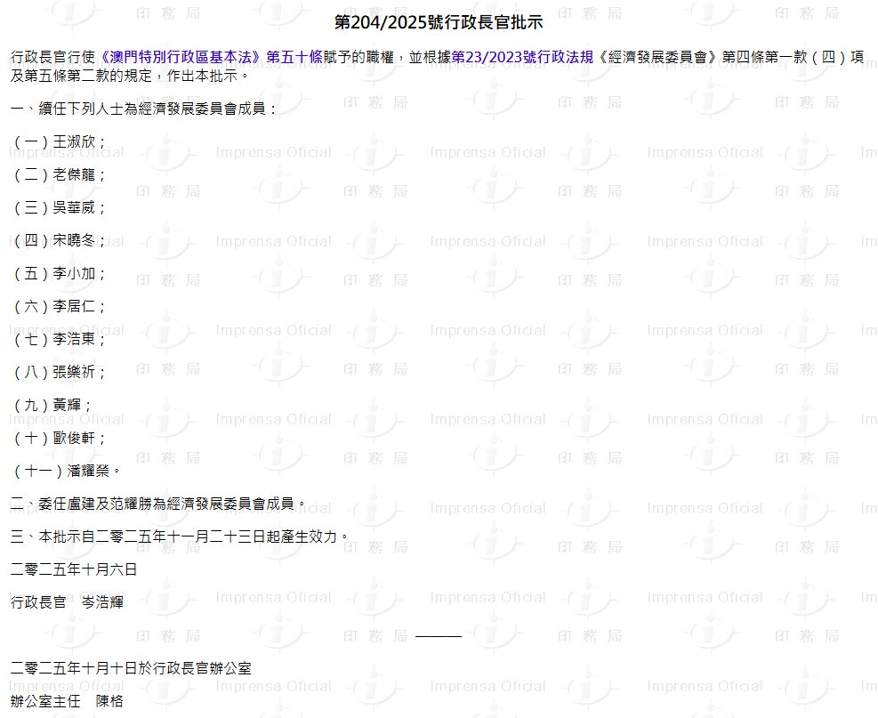 智通财经APP获悉,随着澳门经济发展委员会原有大部分成员两年任期即将完结,澳门特首岑浩辉于周三(10月15日)作出最新批示,续任11 名成员,其中包括港交所(00388)前行政总裁李小加在内,另委任卢建、范耀胜为该委员会新成员。该项新批示将于11月23日生效。 李小加,于2023年11月23日起,获时任澳门特首贺一诚批示,委任加入经济发展委员会。经济发展委员会是澳门特首辖下两个咨询组织之 一,主要是协助政府制定经济发展策略和经济相关政策提供意见及建议,讨论的范围,涵盖经济发展方向、社会经济发展策略、经济适度多 元政策、新兴产业发展政策、中小企业发展政策等。 | | 第204/2025號行政長官批示 | | | 第后 | | --- | --- | --- | --- | --- | | 行政長官行使《澳門特別行政區基本法》第五十條賦予的職權、並根據第23/2023號行政法規《經濟發展委員會》第四條第一款(四)項。 | | | | | | 及第五條第二款的規定,作出本批示。 | | | | | | 一、續任下列人士為經濟發展委員會成員: | ET 所 同 | | | | | 一)主救网: mprensa Ofi ...