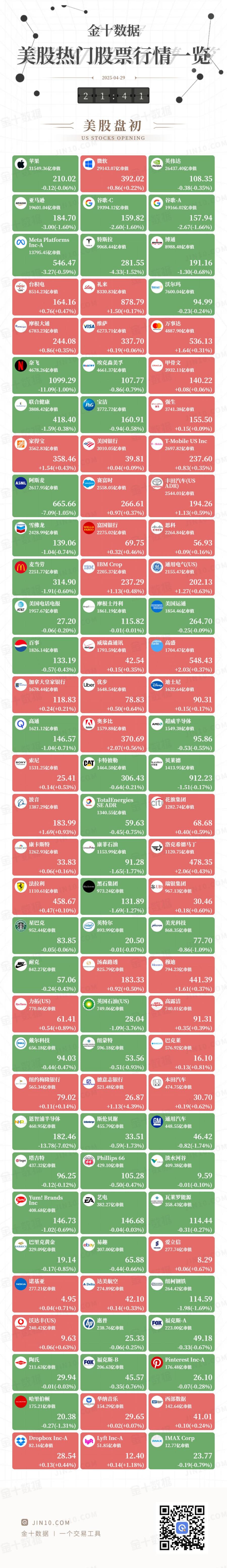 金十图示:2025年04月29日(周二)美股热门股票行情一览(美股盘初)