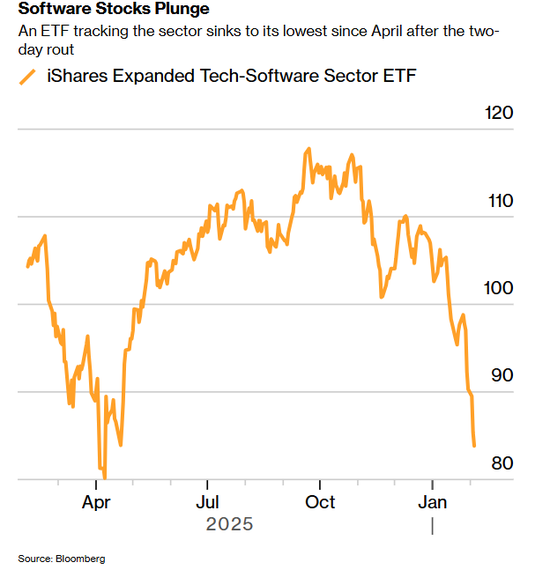 There have been many AI-driven selloffs in the three years since ChatGPT burst into the mainstream. Nothing, though, quite rivals the rout rippling through stock and credit markets this week.For one, there’s the sheer speed and breadth of it. In the span of two days, hundreds of billions of dollars were wiped off the value of stocks, bonds and loans of companies big and small across Silicon Valley. Software stocks were at the epicenter, plunging so much that the value of those tracked in an iShares ETF has ...