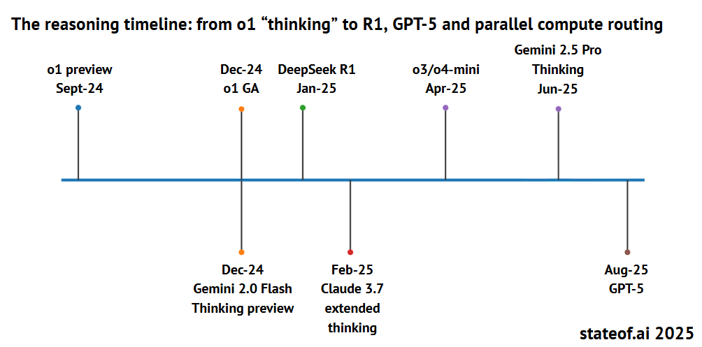 Core Insights - The AI industry is transitioning from hype to real business applications, with significant revenue growth observed among leading AI-first companies, reaching an annualized total revenue of $18.5 billion by August 2025 [3][42]. Group 1: AI Industry Overview - AI is becoming a crucial driver of economic growth, reshaping various sectors including energy markets and capital flows [3]. - The "State of AI Report (2025)" by Nathan Benaich connects numerous developments across research, industry, politics, and security, forming a comprehensive overview of the AI landscape [5]. - The report emphasizes the evolution of AI from a research focus to a transformative production system impacting societal structures and economic foundations [5]. Group 2: AI Model Developments - 2025 is defined as the "Year of Reasoning," highlighting advancements in reasoning models such as OpenAI's o1-preview and DeepSeek's R1-lite-preview [6][8]. - Major companies released reasoning-capable models from September 2024 to August 2025, including o1, Gemini 2.0, and Claude 3.7 [11]. - OpenAI and DeepMind continue to lead in model performance, but the gap is narrowing with competitors like DeepSeek and Gemini [17]. Group 3: Revenue and Growth Metrics - AI-first companies are experiencing rapid revenue growth, with median annual recurring revenue (ARR) for enterprise and consumer AI applications exceeding $2 million and $4 million, respectively [42][48]. - The growth rate of top AI companies from inception to achieving $5 million ARR is 1.5 times faster than traditional SaaS companies, with newer AI firms growing at an astonishing rate of 4.5 times [45]. - The adoption rate of paid AI solutions among U.S. enterprises surged from 5% in early 2023 to 43.8% by September 2025, indicating strong demand [48]. Group 4: Market Trends and Predictions - The report predicts that AI-generated games will become popular on platforms like Twitch, and a Chinese model may surpass several Silicon Valley models in rankings [5][75]. - The rise of open-source models in China is noted, with Alibaba's Qwen model gaining significant traction in the global developer community [24][26]. - AI is shifting from being a tool to a scientific collaborator, actively participating in the generation and validation of new scientific knowledge [34]. Group 5: Challenges and Issues - Traditional benchmark tests for AI models are becoming less reliable due to data contamination and variability, leading to a focus on practical utility as a measure of AI capability [21][22]. - Several major AI companies faced significant operational challenges and public scrutiny over technical failures and ethical concerns [39][40]. - The report highlights the financial pressures on AI coding companies, which face challenges in maintaining profitability despite high valuations [50][51].