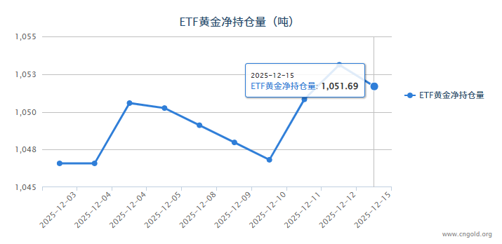 11:20 0 ··· 黄金ETF持仓报告 黄金ETF总持仓变化 更新时间:2025-12-15 1.060 1,050 1.040 1.030 1.020 1.010 2025-10-29 2025-11-19 2025-12-10 2025-10-08 EBC黄金ETF持仓报告解读 全球最大的黄金ETF SPDR Gold Trust持仓量 … 展开 ( 公布机构:美国SPDR Gold Trust 当前总持仓 1051.69 吨黄金 0 截至12月16日,全球最大的黄金ETF SPDR Gold Trust持仓量为1051.69吨,较前一个交易日维持不变。12月16日,现货黄金震荡盘整于4300美元/盎司关口 附近,在非农数据出炉之后最高曾反弹至4335美元/盎司附近,随后回落至4300美元/盎司左右,收于4302.06美元/盎司,跌3.29美元/0.08%。 基本面消息,金价周二在触及盘中高点后掉头向下,交易员消化美国最新就业报告后,黄金回吐早盘涨幅。姗姗来迟的非农就业报告显示劳动力市场疲 软,一度推动金价升至4335美元,但随后因零售销售核心指标大涨,显示消费支出强劲而有所回落。 投资者还关注美联储 ...