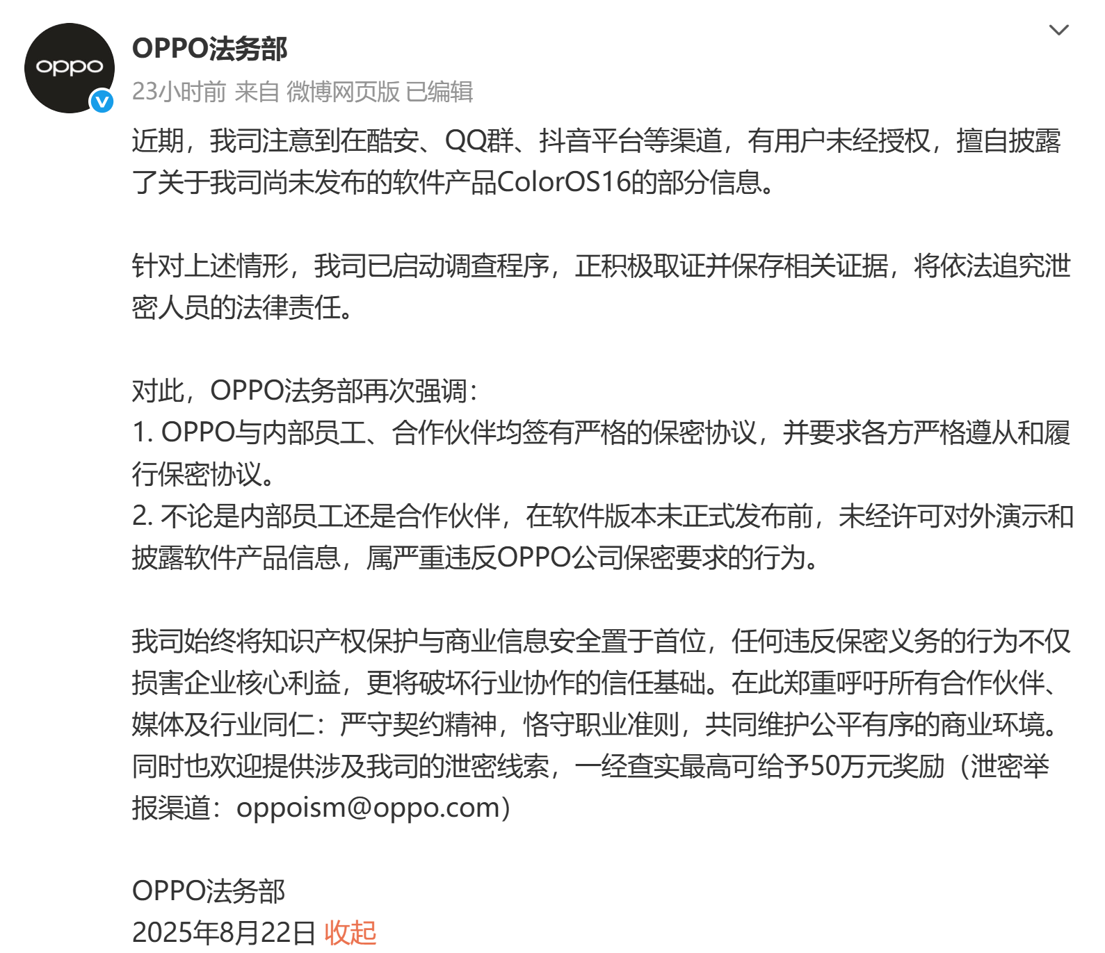Core Viewpoint - OPPO has initiated an investigation regarding unauthorized disclosures of its upcoming software product ColorOS16, which were leaked on various platforms [1] Group 1 - OPPO's legal department announced the unauthorized disclosure of information about ColorOS16 on platforms such as Coolapk, QQ groups, and Douyin [1] - The company is actively collecting evidence and will pursue legal action against those responsible for the leaks [1] - OPPO is offering a reward of up to 500,000 yuan for verified tips regarding the leak and has provided channels for reporting [1]