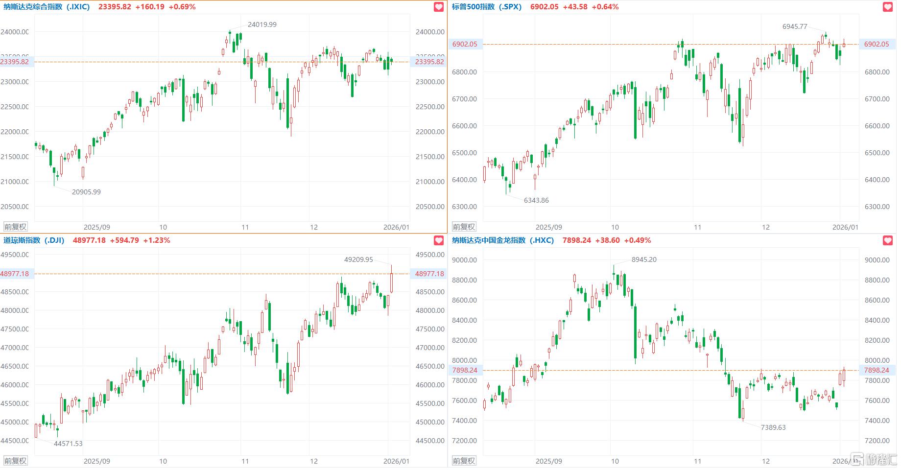 Market Performance - The three major US stock indices all closed higher, with the Dow Jones soaring nearly 600 points, ultimately closing up over 1% at 48,977.18, marking a new historical high [1] - The Nasdaq China Golden Dragon Index rose by 0.49%, while the Nasdaq 100 futures increased by 0.76% [2] Sector Performance - The energy sector within the S&P 500 index saw a significant increase of 2.7%, driven by major stocks like ExxonMobil and Chevron [3] - The Philadelphia Semiconductor Index rose by 1.07%, with notable gains in companies such as Applied Materials and ASML, which both increased by over 5% [3] Notable Stocks - Tesla and Amazon both saw gains of over 3%, while Facebook and Google also experienced slight increases [3] - Neuralink, a brain-machine interface company led by Elon Musk, surged by over 31% following news of plans to significantly increase production by 2026 [5] Commodity Prices - International oil prices strengthened, with both WTI and Brent crude oil rising nearly 2% [6] - Gold and silver prices opened slightly higher, with gold at $4,450.15, up 0.07%, and silver at $76.755, up 0.29% [9] Cryptocurrency Market - The cryptocurrency market saw a collective surge, with Bitcoin surpassing $94,000, marking a 3.36% increase [10]