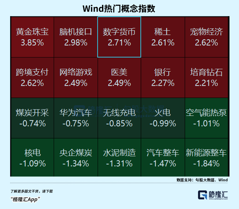6月2日,港股市场端午假期后首日开市,便上演幅度惊人的超级深V行情。 今天,股市并没有受到假期外围下跌,以及特朗普关税负面言论的影响。 各大指数均收红,交易额也有所上升。 说到最活跃的概念板块,金融科技是其中之一,具体看有数字货币、跨境支付等等。 | | Wind热门概念指数 | | | | --- | --- | --- | --- | | 黄金珠宝 脑机接口 | 数字货币 | 稀土 | 宠物经济 | | 2.98% 3.85% | 2.71% | 2.61% | 2.62% | | 跨境支付 网络游戏 | 医美 | 银行 | 培育钻石 | | 2.62% 2.49% | 2.49% | 2.27% | 2.21% | | 煤炭开采 华为汽车 | 无线充电 | 人家火电 | 空气能热泵 | | -0.74% -0.75% | -0.85% | -0.99% | -1.01% | | 核电 央企煤炭 | 水泥制造 | 汽车整车 | 新能源整车 | | -1.09% -1.34% | -1.31% | -1.47% | -1.84% | | | | | **** **** **** **** **** | 数字 ...