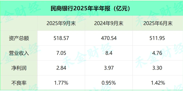 | | | 民商银行2025年半年报 (亿元) | | | --- | --- | --- | --- | | | 2025年9月末 | 2024年9月末 | 2025年6月末 | | 资产总额 | 518.57 | 470.54 | 511.95 | | 营业收入 | 7.05 | 8.4 | 4.76 | | 净利润 | 2.84 | 3.97 | 3.30 | | 不良率 | 1.77% | 0.95% | 1.42% | 资产质量方面,民商银行不良率有所上升,截至2025年9月末为1.77%,去年同期为0.95%,上季度末为 1.42%。 前三季度营收、净利同比下滑 近日,温州民商银行股份有限公司(下称民商银行)发布了2025年三季度报告。 2025年前三季度,民商银行实现营业收入7.05亿元,同比下降16.07%;实现净利润2.84亿元,同比下降 28.46%。 截至2025年9月末,民商银行总资产518.57亿元,较去年同期增长10.21%,较上季度末微增。 对比2025年上半年报,民商银行在今年第三季度实现营业收入2.29亿元,但净利润亏损0.46亿元。 今年1月,该笔股权被浙江杭叉控股股份有限 ...