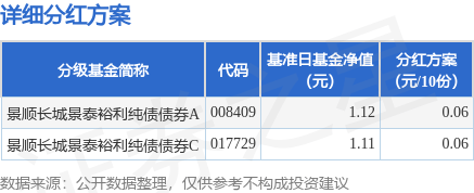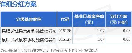 证券之星消息,11月25日发布《景顺长城景泰永利纯债债券型证券投资基金分红公告》。本次分红为 2025年度第一次分红。公告显示,本次分红的收益分配基准日为11月11日,详细分红方案如下: 以上内容为证券之星据公开信息整理,由AI算法生成(网信算备310104345710301240019号),不构成 投资建议。 | 分级基金筒称 代码 | 墓准日基金净值 分红方案 | | | | --- | --- | --- | --- | | | (元) | | (元/10份) | | 景顺长城景泰永利纯债债券A 016126 | | 1.07 | 0.05 | | 景顺长城景泰永利纯债债券C 016127 | | 1.07 | 0.05 | 本次分红对象为权益登记日在注册登记机构登记在册的本基金全体基金份额持有人。,权益登记日为11 月26日,现金红利发放日为11月27日。选择红利再投资的投资者其现金红利转换为基金份额的基金份额 净值确定日:2025年11月26日;选择红利再投资方式的投资者,其红利再投资所转换的基金份额将于 2025年11月27日计入其基金账户,下一个工作日起可以查询、赎回。根据相关法律法规的规定,投 ...