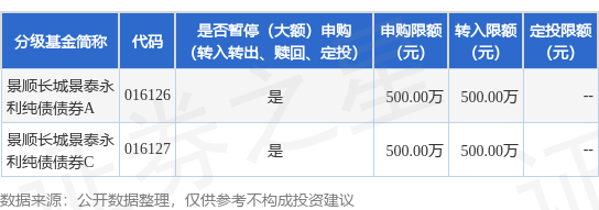 以上内容为证券之星据公开信息整理,由AI算法生成(网信算备310104345710301240019号),不构成 投资建议。 证券之星消息,11月25日景顺长城基金管理有限公司发布《关于景顺长城景泰永利纯债债券型证券投资 基金暂停接受非个人投资者伍佰万元以上申购及转换转入业务的公告》。公告中提示,为充分保护基金 份额持有人利益,保障基金平稳运作,自2025年11月25日起景顺长城景泰永利纯债债券型证券投资基金 暂停接受非个人投资者伍佰万元以上申购及转换转入业务,申购、转换转入上限金额为500.0万元,下 属分级基金调整明细如下: | 分级基金筒称 | 代码 | 是否暫停(大额)申购 (转入转出、赎回、定投) | | 申购限额 转入限额 定投限额 | (元) | | --- | --- | --- | --- | --- | --- | | | | | (元) | (元) | | | 景顺长城景泰永 利纯债债券A | 016126 | 분 | 500.00万 | 500.00万 | | | 景顺长城景泰永 利纯债债券C | 016127 | 를 | 500.00万 | 500.00万 | | ...