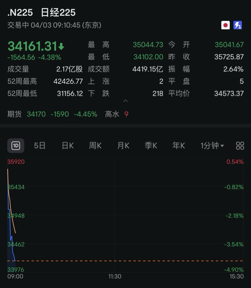 据新华社华盛顿4月2日消息,美国总统特朗普2日在白宫签署关于所谓"对等关税"的行政令,宣布美国对贸易伙伴加 征10%的"最低基准关税",并对某些贸易伙伴征收更高关税。 "对等关税"宣布后,美股期货全线跳水。截至记者发稿时,标普500股指期货跌超3%,纳指期货跌超4%,道琼斯指数 期货跌超2%。标普500波动率指数期货飙升7.5%至23.65。 大型跨国企业股价普遍承压,耐克和苹果在美股盘后交易时段均跌超7%;科技股同样整体陷入风险规避情绪中,英伟 达盘后跌超5%,特斯拉盘后跌超7%。 与此同时,资金涌入避险资产,现货黄金亚洲时间段早盘向上突破3160美元/盎司,截至发稿时,上涨0.82%。 美股市场的悲观情绪也拖累了亚洲市场表现,日韩股市开盘再度大跌。日经225指数周四开盘下跌1.9%,截至发稿时 跌幅扩大至4%;韩国综合指数周四开盘下跌2.5%。 .N225 日经225 交易中 04/03 09:10:45 (东京) 最 34161.31+ 35044.73 今 开 35041.67 高 最 35725.87 let 34102.00 昨 r -1564.56 -4.38% 成交量 2.17亿股 成交额 2 ...