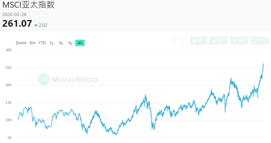 亚洲股市跑赢了欧洲和美国基准指数,因为投资者涌向支撑AI基础设施扩张的公司,将该地区的企业视为供应链中的"卖铲人"。相比之下,这项 新技术的颠覆性潜力数周来一直扰乱着美国各行业的股票,这被称为"AI恐慌交易"。 管理着超过20万亿美元资产的全球资产管理公司对新兴市场股票、货币、国内债券和信贷的看涨情绪日益高涨,这可能为该板块打破纪录的涨势 提供新的动力。 2月27日,亚洲股市正迈向有史以来表现最好的2月。投资者大举买入该地区提供人工智能(AI)基础设施建设的公司,推动了这一创纪录的涨 幅。 MSCI亚太指数尽管今日小幅上涨,本月累计上涨6.3%。这是该指数自1998年创立以来的最佳2月表现。该指标也有望连续第三个月跑赢标普500 指数。周五美国股指期货下跌,预示华尔街基准指数将进一步走低。 韩国作为AI投资的风向标,是亚洲表现最亮眼的市场。韩国综合股价指数(Kospi)本月上涨约18%,今年迄今飙升46%,成为全球表现最好的基 准指数。 花旗集团(Citigroup Inc.)审查了全球一些最大资产管理公司发布的展望,发现基金增加了对亚洲、拉丁美洲以及欧洲、中东和非洲市场的多头 头寸。这一发现出现之际,MSC ...