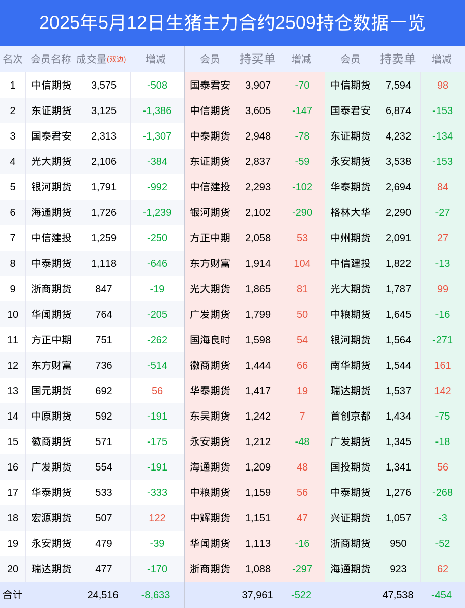 新浪期货 根据交易所数据,截至5月12日收盘主力合约生猪2509,涨跌-0.22%,成交量1.89万手,持仓数据显示前20席位呈现净空, 差额头寸为9577手。 生猪期货全合约总计成交3.10万手,比上一日减少6053手。全合约前20席位多头持仓7.67万手,比上一日减少720手。全合约前20 席位空头持仓9.24万手,比上一日减少475手。 (*文中全合约指交易所公布持仓成交数据的所有合约) 根据合并数据显示,多头前三席位为国泰君安,总持仓9243、中信期货,总持仓7753、方正中期,总持仓5294;空头前三席位为 国泰君安,总持仓13767、中信期货,总持仓11827、永安期货,总持仓5739; 主力合约前20席位中,多头增仓前三名分别是:东方财富、持仓1914、增仓104,光大期货、持仓1865、增仓81,徽商期货、持仓 1444、增仓66;多头减仓前三名分别是:浙商期货、持仓1088、减仓-297,银河期货、持仓2102、减仓-290,中信期货、持仓 3605、减仓-147; 主力合约前20席位中,空头增仓前三名分别是:南华期货、持仓1544、增仓161,瑞达期货、持仓1537、增仓142,光大期货、 ...