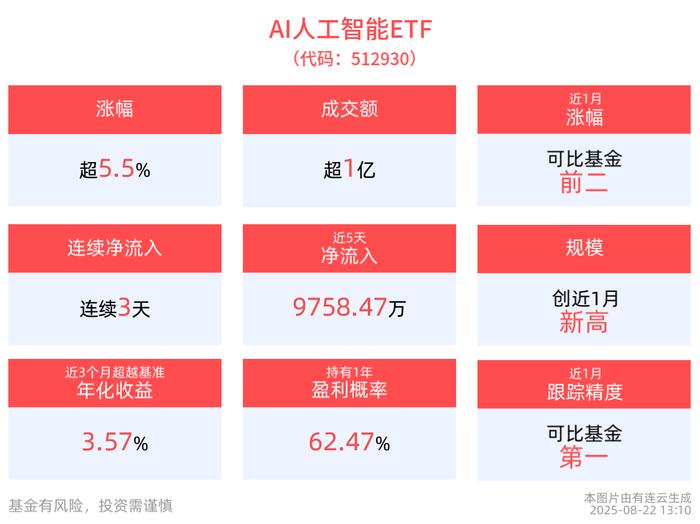 截至2025年8月22日 14:54,中证人工智能主题指数(930713)强势上涨6.62%,成分股昆仑万维(300418)上涨20.01%,寒武纪(688256)上涨20.00%,深信服 (300454)上涨14.63%,景嘉微(300474),中科曙光(603019)等个股跟涨。AI人工智能ETF(512930)上涨7.00%,最新价报1.88元。 流动性方面,AI人工智能ETF盘中换手10.78%,成交2.22亿元,市场交投活跃。拉长时间看,截至8月21日,AI人工智能ETF近1周日均成交1.65亿元。 从资金净流入方面来看,AI人工智能ETF近3天获得连续资金净流入,最高单日获得6005.79万元净流入,合计"吸金"1.13亿元,日均净流入达3760.20万元。 费率方面,AI人工智能ETF管理费率为0.15%,托管费率为0.05%,费率在可比基金中最低。 跟踪精度方面,截至2025年8月21日,AI人工智能ETF近1月跟踪误差为0.006%,在可比基金中跟踪精度最高。 AI人工智能ETF紧密跟踪中证人工智能主题指数,中证人工智能主题指数选取50只业务涉及为人工智能提供基础资源、技术以及应用支持的上市 ...