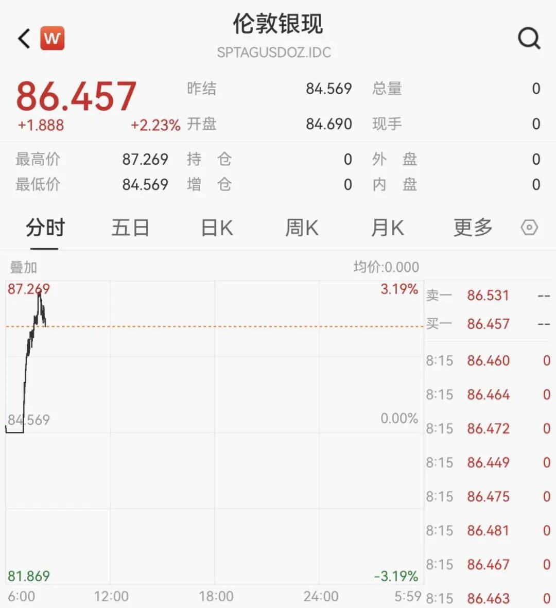 2月23日,现货白银一度涨超3%,现报86.46美元/盎司。 | W | 伦敦银现 | | | | | O | | --- | --- | --- | --- | --- | --- | --- | | | SPTAGUSDOZ.IDC | | | | | | | 86.457 | 昨结 | 84.569 | 总量 | | | 0 | | +1.888 | +2.23% 开盘 | 84.690 | 现手 | | | 0 | | 最高价 | 持 87.269 仓 | 0 | 外 물 | | | 0 | | 最低价 | 84.569 물 仓 | 0 | 内 물 | | | 0 | | 分时 | 五日 日K 周K | | 月K | | 車名 | (0) | | 叠加 | | | 均价:0.000 | | | | | 87.269 | | | 3.19% 卖一 | | 86.531 | | | | | | | ग्रे | 86.457 | | | | | | | 8:15 8:15 | 86.460 86.464 | 0 0 | | | | | 0.00% | | | | | 84569 | | | | | 8:1 ...