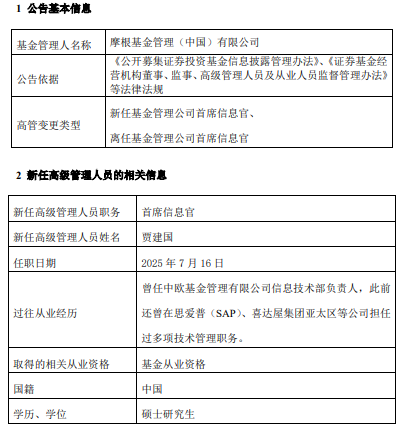 中国经济网北京7月17日讯 今日,摩根基金公告,任命贾建国为首席信息官,卢蓉离任。 贾建国曾任中欧基金管理有限公司信息技术部负责人,此前还曾在思爱普(SAP)、喜达屋集团亚 太区等公司担任过多项技术管理职务。 | 基金管理人名称 | 摩根基金管理(中国)有限公司 | | --- | --- | | 公告依据 | 《公开募集证券投资基金信息披露管理办法》、《证券基金经 营机构董事、监事、高级管理人员及从业人员监督管理办法》 | | | 等法律法规 | | 高管变更类型 | 新任基金管理公司首席信息官、 | | | 离任基金管理公司首席信息官 | | 新任高级管理人员职务 | 首席信息官 | | --- | --- | | 新任高级管理人员姓名 贾建国 | | | 任职日期 | 2025年7月16日 | | | 曾任中欧基金管理有限公司信息技术部负责人,此前 | | 过往从业经历 | 还曾在思爱普(SAP)、喜达屋集团亚太区等公司担任 | | | 过多项技术管理职务。 | | 取得的相关从业资格 | 基金从业资格 | | 国籍 中国 | | | 学历、学位 | 硕士研究生 | (责任编辑:康博) ...