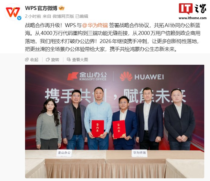 IT之家 2 月 2 日消息,WPS 官方微博今日宣布与华为终端签署战略合作协议,合作升级,宣称"2026 年继续携手冲刺,让更多创新特性落地"。 IT之家注意到,华为终端 BG 首席执行官何刚今日发文透露,华为金山办公团队一起攻克了很多难题,例如折叠电脑双屏演讲者模式、一句话生成 PPT 等。 何刚还预告:今年还会上线文档 / 图片一碰传、PDF / Excel 大文件秒开等鸿蒙特色功能。 IT之家注意到,华为在 2024 年 6 月 21 日举行的 HDC 2024 开发者大会上,金山办公 WPS 软件架构师覃欢宣布 WPS 完成鸿蒙原生版应用开发,支持完整运 行在鸿蒙平板和手机端,其中平板端完整具备 PC 端基本上所有的能力,包括办公读写操作、云账号打通、多端协同、多人编辑等。 | 00:14 8:08 | | | | | | | | | | | | | | | | | ? @ + | | | --- | --- | --- | --- | --- | --- | --- | --- | --- | --- | --- | --- | --- | --- | --- | --- | --- | --- ...