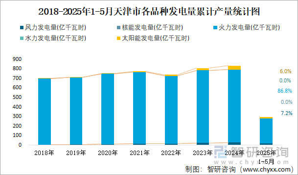 2025年1-5月天津市能源生产情况:天津市发电量297.3亿千瓦时,同比下滑13.1%