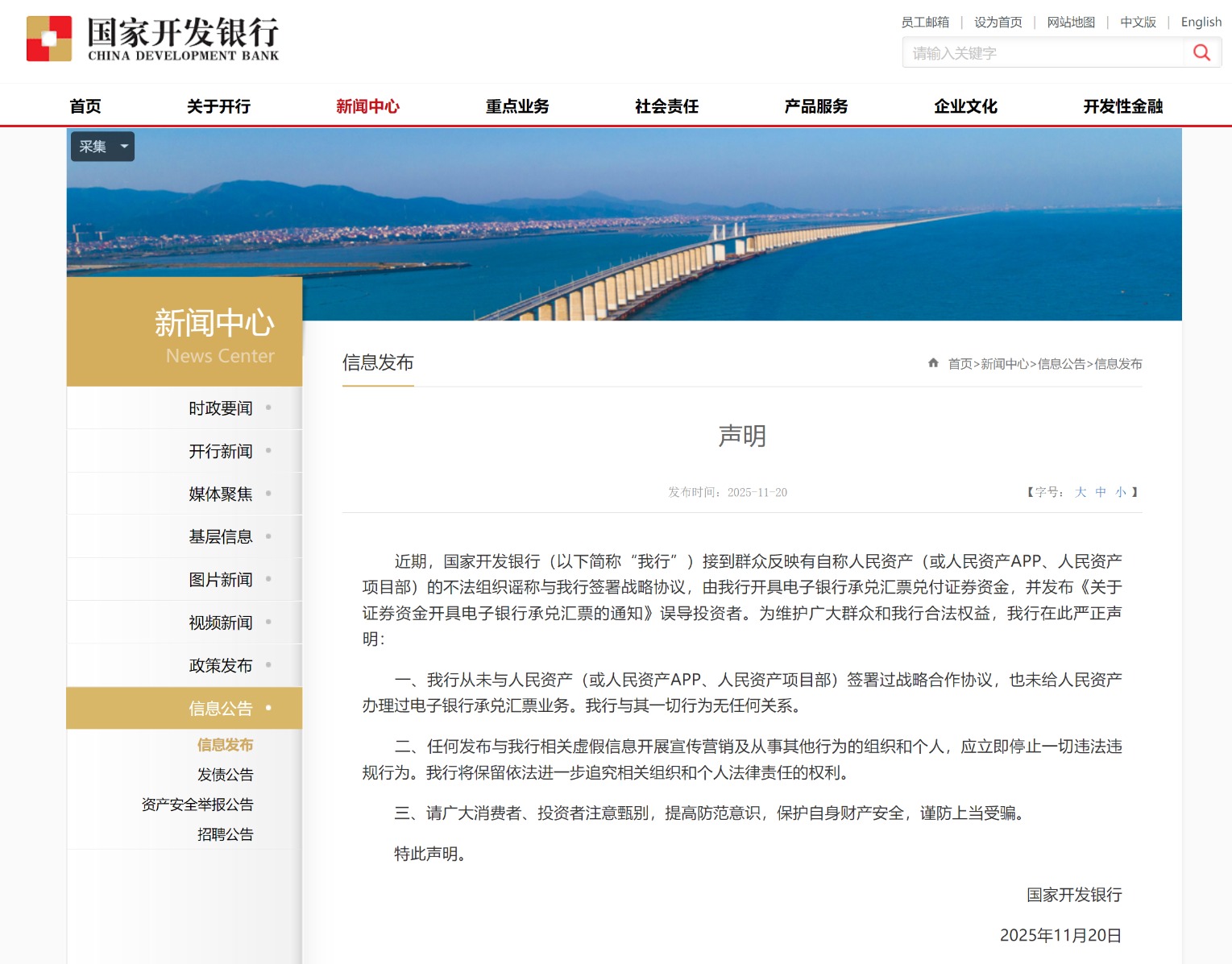 声明表示,近期,国开行接到群众反映有 自称人民资产(或人民资产APP、人民资产项目部)的不 法组织谣称与国开行签署战略协议, 由国开行开具电子银行承兑汇票兑付证券资金,并发布《关于 证券资金开具电子银行承兑汇票的通知》误导投资者。 为维护广大群众和国开行合法权益,国家开发银行严正声明: 来源:国家开发银行网站 11月20日,国家开发银行(简称国开行)发布声明。 一、国开行从未与人民资产(或人民资产APP、人民资产项目部)签署过战略合作协议,也未给人 民资产办理过电子银行承兑汇票业务。 国开行 与其一切行为无任何关系。 二、任何发布与 国开行 相关虚假信息开展宣传营销及从事其他行为的组织和个人,应立即停止一 切违法违规行为。 国开行 将保留依法进一步追究相关组织和个人法律责任的权利。 三、请广大消费者、投资者注意甄别,提高防范意识,保护自身财产安全,谨防上当受骗。 截图来源:国家开发银行网站 ...