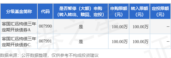 以上内容为证券之星据公开信息整理,由AI算法生成(网信算备310104345710301240019号),不构成 投资建议。 证券之星消息,12月2日富国基金管理有限公司发布《关于富国汇远纯债三年定期开放债券型证券投资 基金暂停大额申购及转换转入业务的公告》。公告中提示,为了保证基金的平稳运作,保护基金持有人 的利益,自2025年12月3日起富国汇远纯债三年定期开放债券型证券投资基金暂停大额申购及转换转入 业务,下属分级基金调整明细如下: | 分级基金简称 | 代码 | 是否暂停(大额)申购 (转入转出、赎回、定投) | | 申购限额 转入限额 定投限额 | (元) | | --- | --- | --- | --- | --- | --- | | | | | (元) | (元) | | | 富国汇远纯债三年 定期开放债券A | 007990 | 를 | 100.00万 | 100.00万 | | | 富国汇 元纯债三年 定期开放债券C | 007991 | 를 | 100.00万 | 100.00万 | | ...