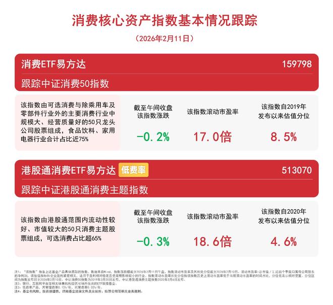 Group 1 - The China Securities Hong Kong Stock Connect Consumer Theme Index decreased by 0.3% and the China Securities Consumer 50 Index fell by 0.2% as of midday closing [1] - The E Fund Consumer ETF (513070) has seen a net inflow of over 700 million yuan over the past five trading days [1] - The China Securities Consumer 50 Index consists of 50 leading companies in major consumer sectors, with food and beverage and home appliance industries accounting for nearly 75% of the index [2] Group 2 - The E Fund Consumer ETF tracks the China Securities Hong Kong Stock Connect Consumer Theme Index, which is composed of 50 liquid and large-cap consumer stocks within the Hong Kong Stock Connect framework [2] - The rolling price-to-earnings ratio of the China Securities Consumer 50 Index is 17.0 times, with a valuation percentile of 8.5% since its inception in 2019 [2] - The rolling price-to-earnings ratio of the China Securities Hong Kong Stock Connect Consumer Theme Index is 18.6 times, with a valuation percentile of 4.6% since its inception in 2020 [2]