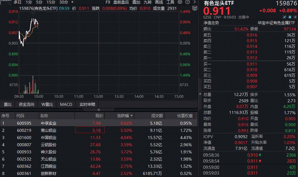 国泰海通指出,铜价受美联储降息预期及矿端紧缺共识推动强势运行,铝加工开工率环比提升支撑高位震荡;贵金属因流动性预期回暖价格 走高,白银低库存加剧涨幅;能源金属中锂需求旺盛但供应季节性走低,钴原料偏紧推升报价;稀土轻重价格走势分化,轻稀土受政策需求 提振上涨。 有色龙头ETF(159876)及其联接基金(联接A:017140,联接C:017141)被动跟踪中证有色指数,该指数前十大权重股分别为紫金矿业、 洛阳钼业、北方稀土、华友钴业、中国铝业、赣锋锂业、山东黄金、中金黄金、天齐锂业、赤峰黄金。 12月5日,截至9时51分,有色龙头ETF(159876)涨声不断,场内价格再涨1.3%。成份股方面,中孚实业、南山铝业和江西铜业表现最为突 出,涨幅分别达到9.17%、6.92%和4.35%。 | | | 多日 1分 5分 15分 30分 ▼ | | | | F9 盘前盤后 叠加 九转 画线 工具 <> 2 | | 有色龙头剧情 | | 159876 | | --- | --- | --- | --- | --- | --- | --- | --- | --- | --- | --- | | | | | | 15987 ...
