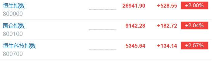 | 恒生指数 | 26941.90 | +528.55 | +2.00% | | --- | --- | --- | --- | | 800000 | | | | | 国企指数 | 9142.28 | +182.72 | +2.04% | | 800100 | | | | | 恒生科技指数 | 5345.64 | +134.14 | +2.57% | | 800700 | | | | 格隆汇2月23日|港股三大指数高开高走,目前均涨超2%,其中恒生科技指数涨2.57%。科网股走强, 华虹半导体涨超4%,美团、中芯国际、京东、比亚迪股份、网易涨超3%,阿里巴巴、小米集团、小鹏 汽车、快手、哔哩哔哩、腾讯涨超2%。 ...