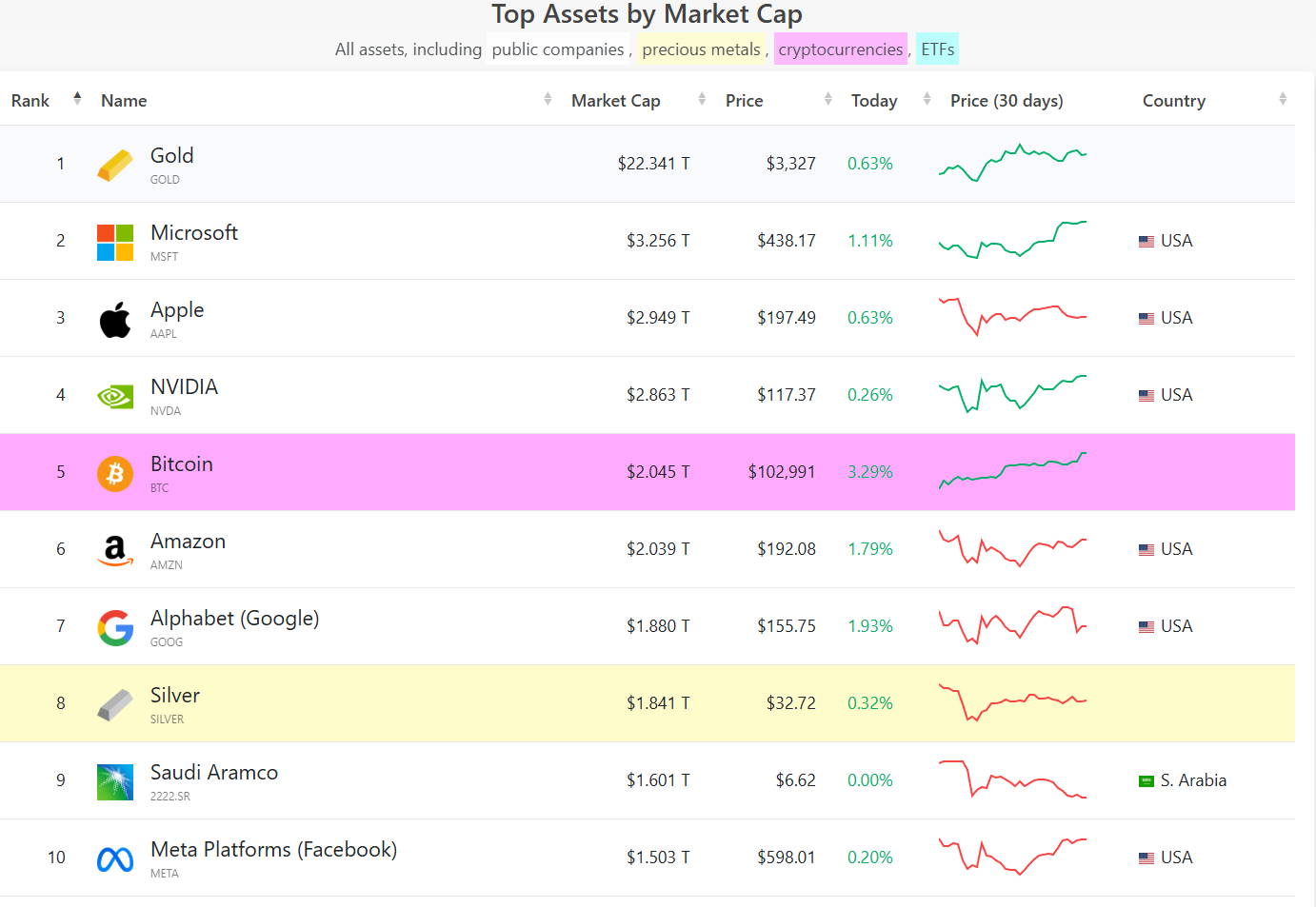 | | | Top Assets by Market Cap | | | | | | --- | --- | --- | --- | --- | --- | --- | | | | All assets, including public companies , precious metals , cryptocurrencies , ETFs | | | | | | Rank + | Name | イト Market Cap | 4 | Price | → Today | → Price (30 day | | 1 | Gold GOLD | $22.341 T | | $3,327 | 0.63% | | | 2 | Microsoft MSFT | $3.256 T | | $438.17 | 1.11% | | | 3 | Apple AAPL | $2.949 T | | $197.49 | 0.63% | | | 4 | NVIDIA NVDA | $2.863 T | | $117.37 | 0.26% | | | 5 | Bitcoin BTC | $2.045 T | | $102,991 ...