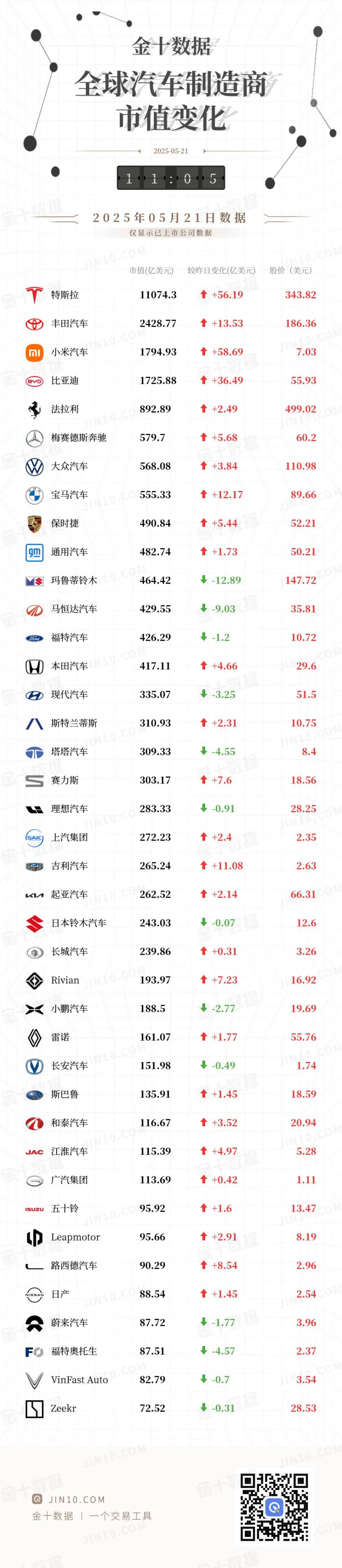 金十图示:2025年05月21日(周三)全球汽车制造商市值变化