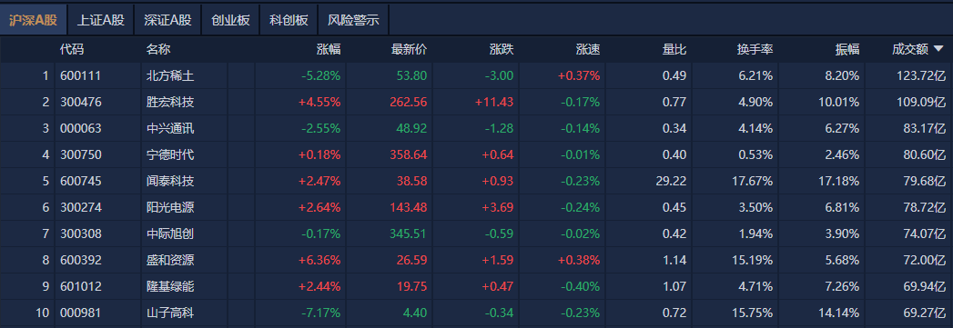 市场早间冲高回落,随后再度翻红。南财金融终端显示,截至早盘收盘,沪指涨0.1%,深成指涨0.00%,创业板指涨0.22%。 盘面上热点较为杂乱,整体高低切换,主要集中在医药、国产软件、消费等方向。 大消费板块反复活跃,国光连锁3连板; 利好刺激下国产软件概念股反弹,久其软件、榕基软件双双涨停; 创新药板块表现活跃,昂利康涨停,亚太药业2连板,广生堂20cm涨停。 个股方面,北方稀土成交额超123亿元居首,胜宏科技、中兴通讯、宁德时代成交额靠前。 | 沪深A股 | 上证A股 | 深证A股 | 创业板 | 科创板 风险警示 | | | | | | | | | --- | --- | --- | --- | --- | --- | --- | --- | --- | --- | --- | --- | | નદસન્તે | | 名称 | | 涨幅 | 最新价 | | | 量比 换手率 | | | 成交额 ▼ | | 1 600111 | | 北方稀土 | | -5.28% | 53.80 | -3.00 | +0.37% | 0.49 | 6.21% | 8.20% | 123.72亿 | | 2 300476 ...