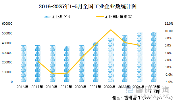 2025年1-5月全国工业企业有519513个,同比增长3.59%