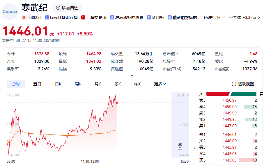 Company Insights - Cambricon Technologies experienced a significant stock increase, reaching a peak of 1464.98 CNY per share, surpassing Kweichow Moutai with a market capitalization exceeding 600 billion CNY [1] - The company reported a remarkable half-year performance with revenue of 2.881 billion CNY, a year-on-year increase of 4347.82%, and a net profit of 1.038 billion CNY, reversing a loss of 530 million CNY from the previous year [4] - Cambricon, established in 2016, focuses on the research and development of artificial intelligence chips, aiming to create core processors for the AI sector [4] Industry Trends - The Chinese government has issued policies to promote the integration of AI across six key sectors by 2027, with expectations for AI applications to reach over 70% penetration, and by 2030, over 90% [4] - The launch of DeepSeek-V3.1 indicates advancements in domestic chip design, reinforcing the trend towards self-sufficiency and domestic substitution in the chip industry [5] - OpenAI's CEO announced plans to invest trillions in AI infrastructure, highlighting the accelerating commercialization of large models and the growing demand for training clusters, which will benefit domestic manufacturers [5] - Goldman Sachs raised Cambricon's target price by 50% to 1835 CNY per share, citing increased capital expenditure in cloud computing and diversified chip platforms as key factors [6] - Analysts predict significant growth in Cambricon's net profit from 2025 to 2027, reflecting higher AI chip shipments [6] - The semiconductor cycle is currently on an upward trend, with AI being the primary growth driver, supported by ongoing demand in cloud AI and accelerating terminal AI applications [6]