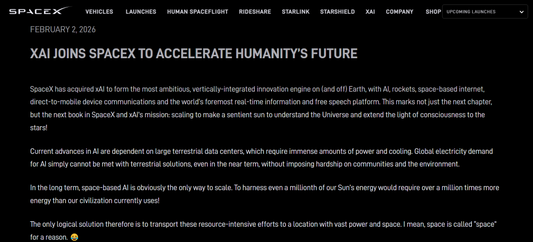 | | | 作为全球最具影响力的商业航天企业之一,SpaceX目前运营着一支可重复使用的火箭机队,拥有可将宇航员送入轨道的载人航天器,并通过Starlink项目 构建起全球规模最大的卫星星座,为数百万用户提供宽带互联网服务。 xAI则是马斯克近年重点押注的人工智能项目。与其他AI公司类似,xAI专注于训练大语言模型,并推出了聊天机器人Grok,已集成至社交媒体平台X(原 Twitter)。不过,xAI正面临来自OpenAI、Anthropic以及谷歌旗下DeepMind等头部公司的激烈竞争。 事实上,SpaceX早在2024年便成为xAI的首批客户之一。在最早的业务整合案例中,xAI的技术已被用于为Starlink互联网服务提供客户支持功能。 当地时间2月2日,美国企业家埃隆.马斯克宣布,太空探索技术公司(SpaceX)已完成对人工智能初创公司xAI的收购。这笔交易被认为是马斯克在"航天+人 工智能(AI)"领域推进纵向一体化布局的重要一步。 此次内部备忘录并未公布具体财务条款。有报道援引有知情人士透露,合并后公司的整体估值约为1.25万亿美元,其中xAI的估值约为2500亿美元。 SpaceX随后确认了这一 ...