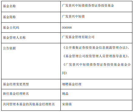 广发景兴中短债广发汇宜一年定期开放债券增聘姚晶