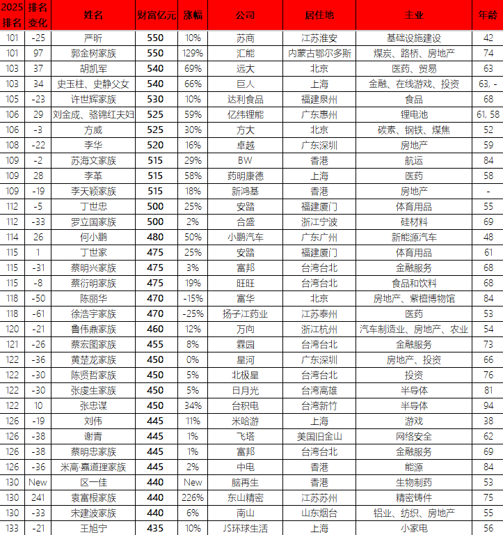 专题:2025胡润百富榜出炉(搜索版) 炒股就看金麒麟分析师研报,权威,专业,及时,全面,助您挖掘潜力主题机会! 10月28日,《2025胡润百富榜》显示,远大集团胡凯军最新财富为540亿元,比上年大幅增加220亿元, 增长率高达69%。其排名也从去年的第140名提升至今年的第103名,前进了37位。胡凯军年龄63岁,其 执掌的远大集团主业涵盖医药与贸易。 声明:本文由AI大模型生成。市场有风险,投资需谨慎 MACD金叉信号形成,这些股涨势不错! 责任编辑:常福强 数据显示,截止2025年9月30日,中国远大集团有限责任公司持有华东医药7.31亿股,占比41.67%,参 考市值303.7亿元;持有远大控股2.15亿股,占比42.74%,参考市值14.12亿元。 附《2025胡润百富榜》部分名单 | 2025 排名 | | 姓名 | 文昌亿元 | 部幅 | 公司 | 居住地 | 主业 | 年齡 | | --- | --- | --- | --- | --- | --- | --- | --- | --- | | H | 变化 | | | | | | | | | 101 | -25 | methe | 550 | ...