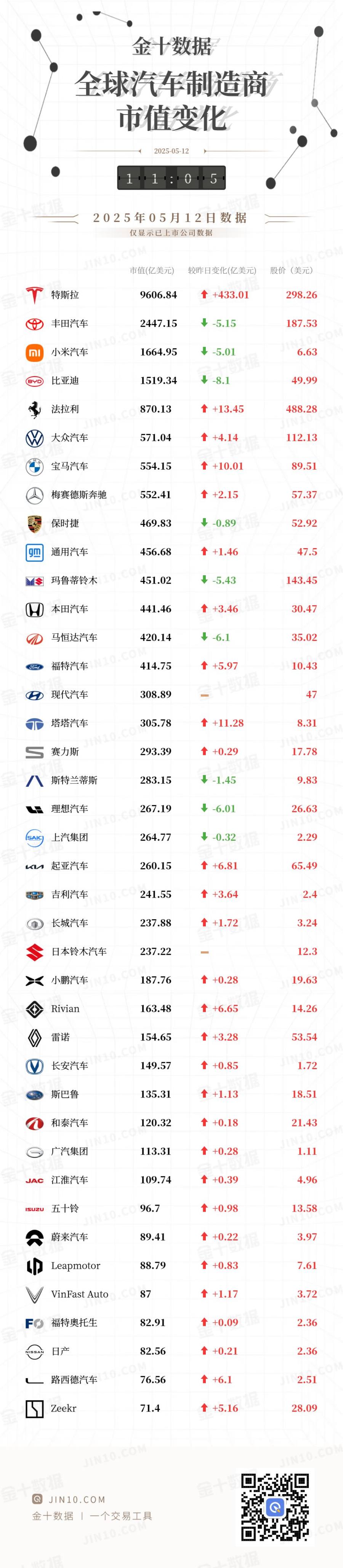 金十图示:2025年05月12日(周一)全球汽车制造商市值变化